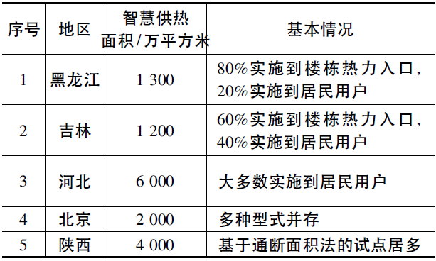 目前,國內部分省、市在供熱系統的部分環節中進行了智慧供熱系統的建設和嘗試。其中黑龍江和吉林省的智慧供熱主要采取實施到樓棟熱力入口的技術路線,也進行了部分實施到居民用戶的嘗試;河北省以實施到居民用戶為主;陜西的試點以基于通斷面積法的方式為主,北京的試點采用多種型式,詳見表1。