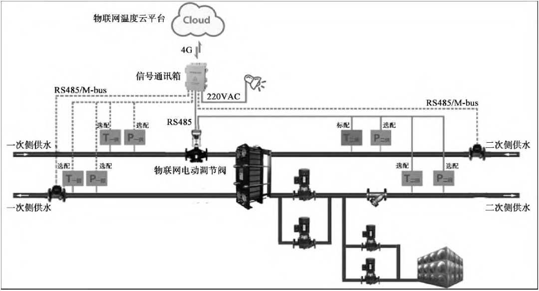 在換熱站一級網供水側配置物聯網電動調節閥,一級網回水、二級網供水側配置物聯網超聲熱量表,同時在廠站動力系統配置物聯網循環水泵及數據采集箱,將數據通過5G通訊傳送至云平臺,在實現對供熱系統參數的實時監控和調節的同時,實現源—網—站的優化調度和大數據分析。詳見圖2。