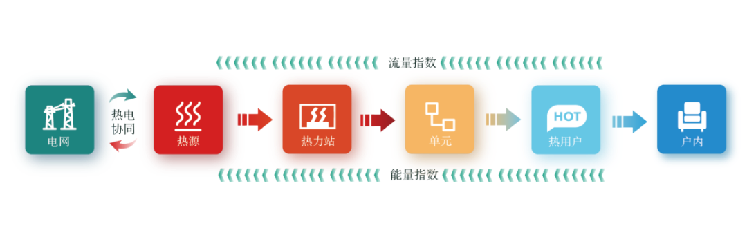 傳統的供熱系統是以“能源生產為導向”,熱源側保持供應總量,用戶側分攤的“推動式”供熱。新型“源-網-站-戶”全域協同的供熱模式是以“負荷需求為導向”,根據實際需求生產的熱量的“拉動式”供熱。利用新一代信息化技術,將水力平衡和熱力平衡的調控需求歸一為各個層級的標準流量指數和能量指數,按“戶內-熱用戶-單元-換熱站-熱源”的順序逐級依次向上傳遞,能量逐級向下精準配送,進而實現包括“熱電協同”在內的“源-網-站-戶”全域協同。
